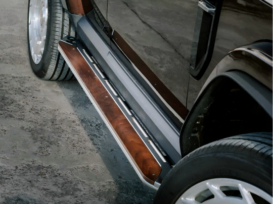 Made from high-quality 304 stainless steel, all components deliver excellent durability and long-lasting shine. The precision polishing and electroplating process ensures a smooth, refined finish that elevates the overall look of the vehicle. To enhance its unique character, the kit is complemented with black walnut wood panels, combining mechanical style with natural elegance.