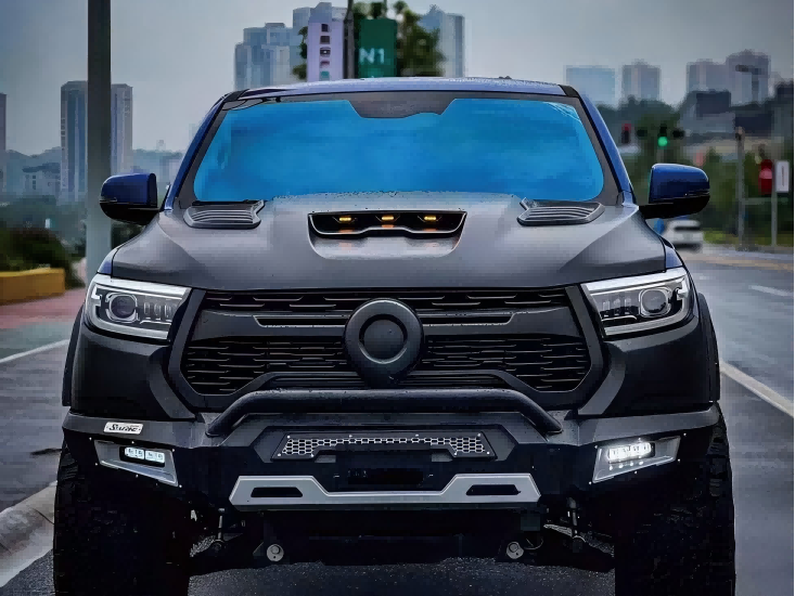 Transform your Great Wall Poer into a true off-road beast with this aggressive steel hood upgrade, featuring functional air intake vents and integrated LED lighting.